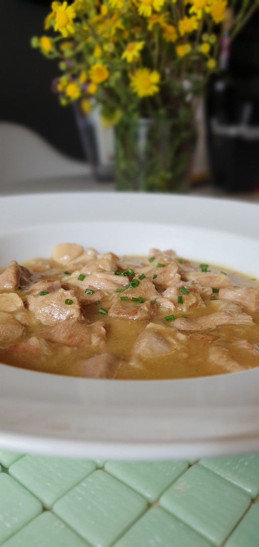 Cortar la cebolla en tacos pequeños y rehogar. Seguidamente introducir el ajo cortadito en trozos pequeños. Salpimentar la carne y pasarla por maicena. Echar la carne en la cazuela y rehogarlo con el sofrito durante 2 minutos. Luego añadir vino blanco y agua hasta cubrir. Dejar cocer a fuego lento durante 1,5 horas.